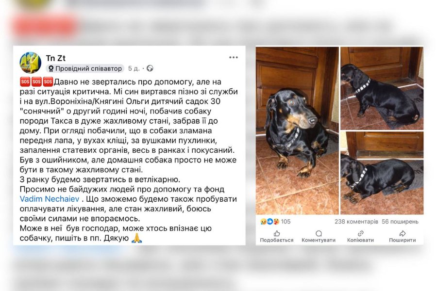 Авторкою посту виявилася зооволонтерка Тетяна. У дописі вона стверджувала, що таксу вночі підібрав її син. За словами жінки, собака перебував у жахливому стані та потребував лікування, бо «у собаки зламана передня лапа, у вухах кліщі, за вушками пухлинки, запалення статевих органів, весь у ранках і покусаний».