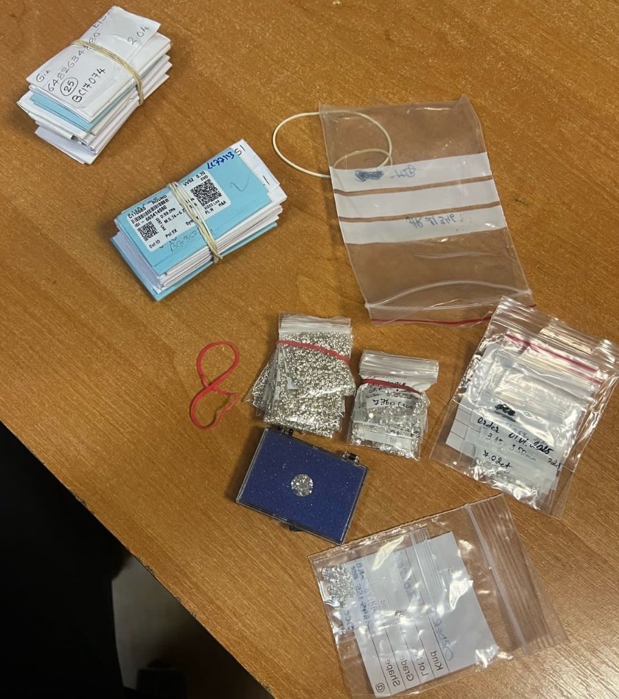 У згортку містилися 21 паперовий, 17 зіп-пакетиків та пластиковий футляр з камінцями. Загальна вага вилученого за протоколом про порушення митних правил товару склала 191 грам. В упакуванні також була інформація з маркуванням про прозорість/чистоту, розміри, якість огранки та навіть QR-коди з посиланням на авторитетне джерело Гемологічного інституту у США, що видає сертифікати якості міжнародного зразка на діаманти. Згідно з цими друкованими або дописаними вручну бірками, орієнтовна маса цієї партії діамантів – мінімум 355 карат. Призначена експертиза, аби підтвердити дорогоцінність та визначити їх вартість.