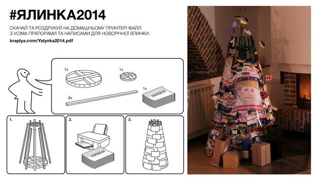 "Красуню-ялинку в кожну хату. Усі, у кого є трішечки рук, скачайте та роздрукуйте на домашньому принтері файл з усіма прапорами та написами для новорічної ялинки – найкрасивішої в історії України, на нашу думку. Конструкція зовсім не важка, зробити ії зможе навіть ваша бабуся", - написали "страйкплакатівці".