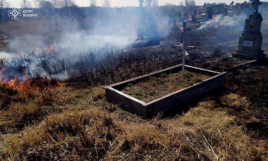"Якщо не бережете живих, хоча б шануйте пам'ять померлих", - з таким меседжем волинські рятувальники звертаються до осіб, які підпалили суху траву на кладовищі в селищі Стара Вижівка.