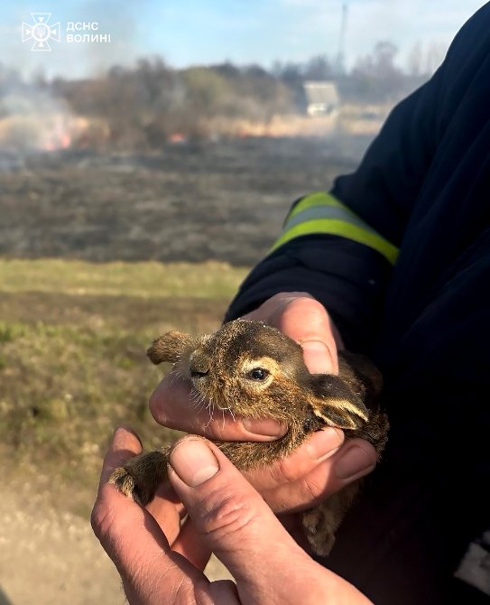 Сьогодні у селищі Благодатному, де горіла суха трава, рятувальники знайшли двох маленьких пухнастиків — обгорілих, наляканих, але живих. Зайченята потрапили у пастку вогню, який невідомі запалили на дачному масиві.