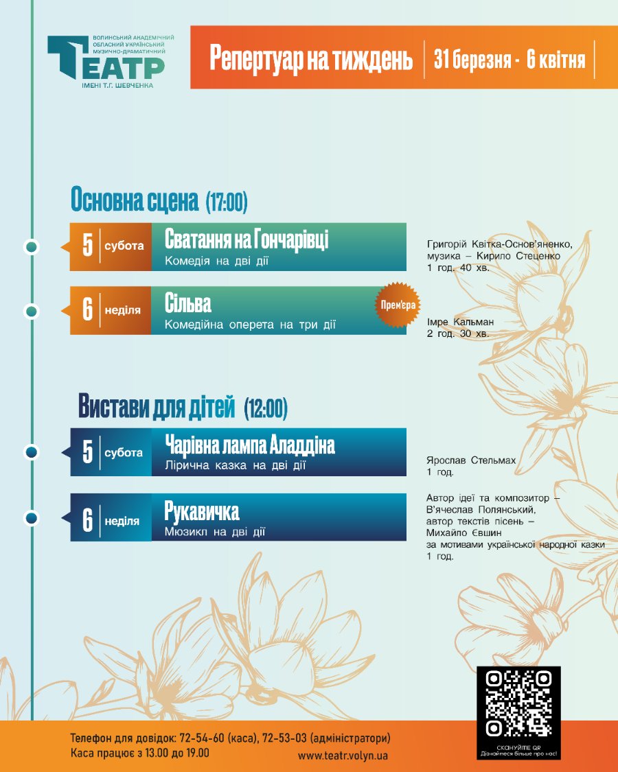 У неділю ввечері, 6 квітня, о 17:00 – комедійна оперета на три дії «Сільва» Імре Кальмана. Режисер-постановник – заслужений діяч мистецтв України Орест Огородник. Тривалість – 2 години 30 хвилин (антракт – 15-20 хвилин).