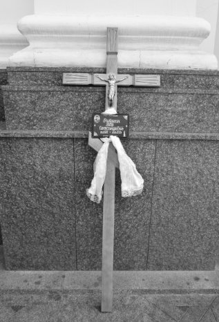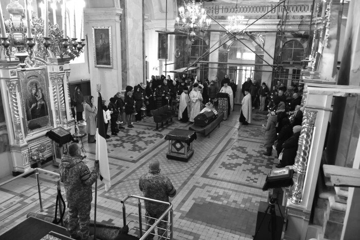 Після завершення заупокійного богослужіння труну з тілом загиблого захисника пронесли Театральним майданом. Біля пам’ятного фотостенда загиблим Героям траурна процесія зупинилася та виконала Державний Гімн.
