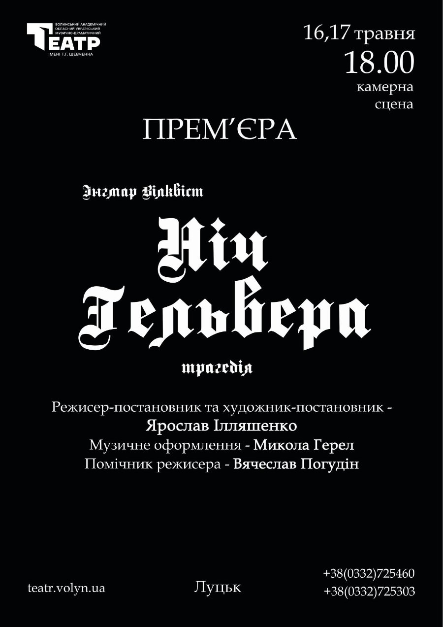 «Ще одна прем’єра у травні – цього разу на камерній сцені! «Ніч Гельвера» Інгмара Вілквіста (псевдонім Ярослава Свержича – польського драматурга, історика мистецтва, професора Варшавської Академії образотворчих мистецтв).