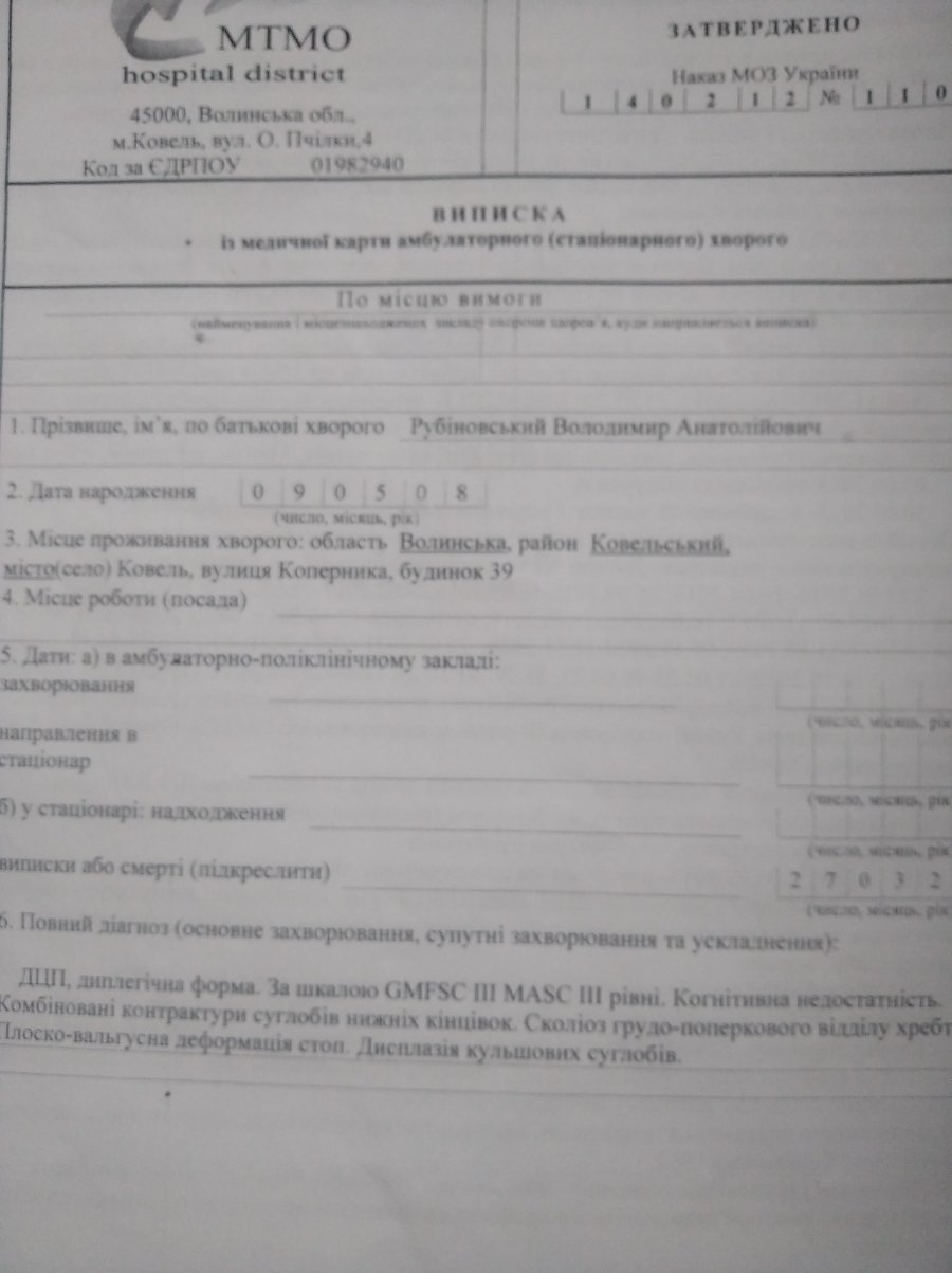 "З історії хвороби Рубіновського Володимира: проходив 18-й курс інтенсивної нейрофізіологічної реабілітації за системою проф. Козявкіна з 31.03.2025 по 09.04.2025 р.
