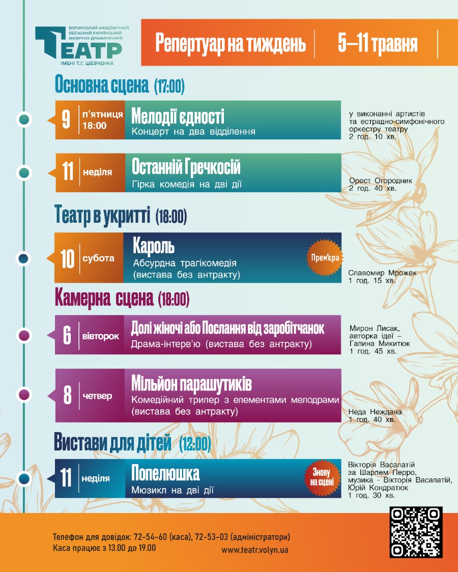 Волинський академічний обласний український музично-драматичний театр імені Тараса Шевченка запрошує лучан та гостей міста на перегляд вистав та концерту.