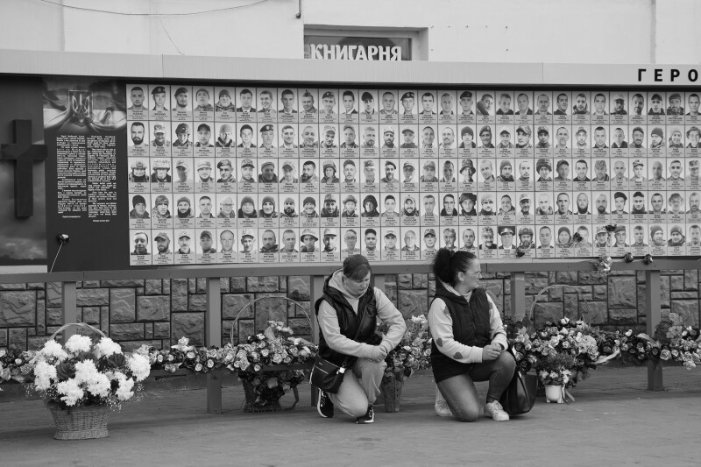 Після завершення богослужіння труну з тілом покійного захисника пронесли Театральним майданом. Біля пам’ятного фотостенда загиблим Героям траурна процесія зупинилася і виконала Державний Гімн.