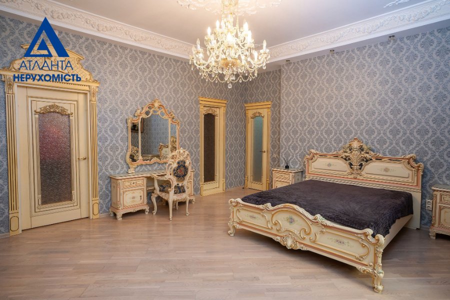 Масивні меблі з різьбленням і позолотою, важкі штори, ліпнина по периметру стелі, кришталеві люстри, гобелени, витинанки на склі й вітражі — кожен елемент говорить про любов господарів до шику.