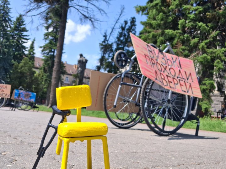 На крісла колісні, які належать організації, помістили плакати з написами про труднощі, з якими зіштовхнулися їх користувачі: вузькі проходи дверей, слизька підлога на пандусах, неналежні кути нахилу пандусів.