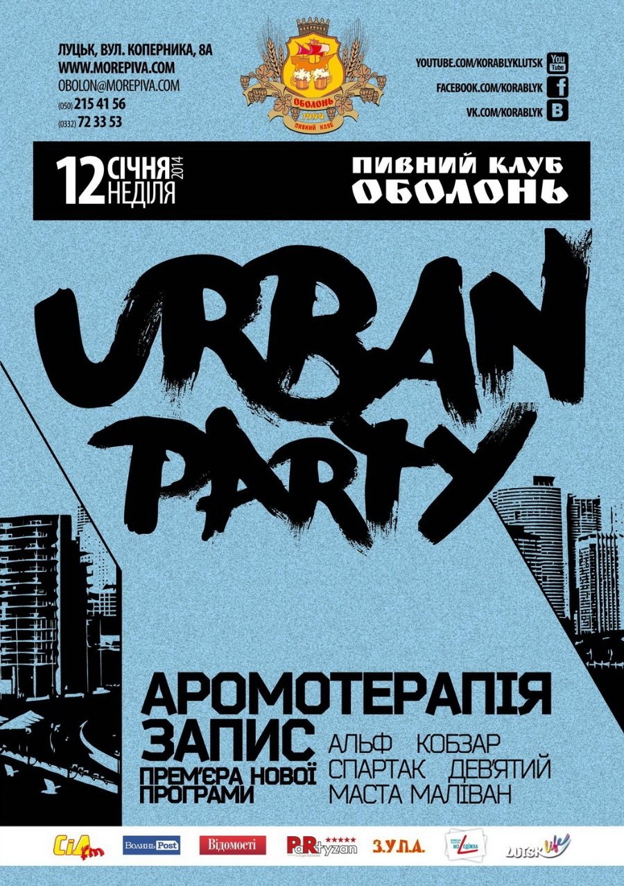 А 12 січня на відвідувачів «Кароблика» чекає «Urban Party». «Нарешті! Після тривалої паузи ми знову вирішили влаштувати нашу «Urban Party». Тим паче у чуваків, які і будуть її творити цього вечора, вже назбиралась добряча порція нового матеріалу! Своєрідна прем’єра від «Аромотерапії Запис», яка цього разу буде в повному складі: Альф, Кобзар, Спартак, Дев’ятий, Маста Маліван. Любителям якісного українського репу радимо не пропустити!» ‒ запрошують організатори.
