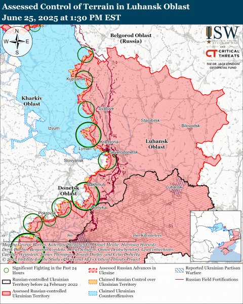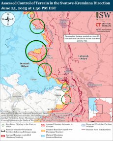 Куп'янський напрямок. Росіяни стверджували, що знаходяться в межах одного кілометра від Куп'янська. ISW отримала геолокаційні дані, які показують, що станом на 25 червня російські війська просунулися на 3,4 кілометра від північного адміністративного кордону Куп'янська.