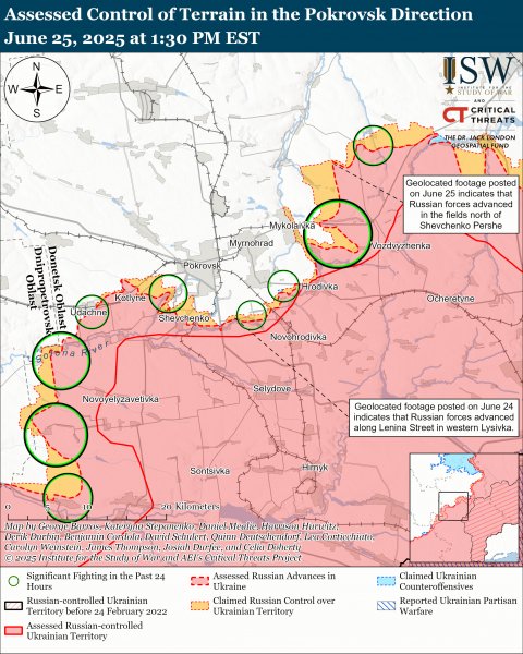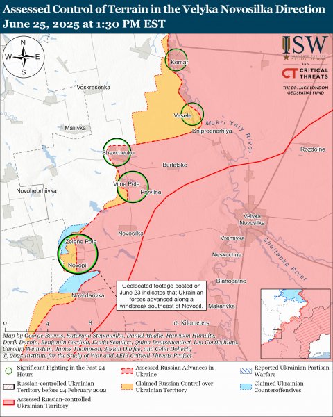 Як зазначити у звіті аналітики, 25 червня російські війська продовжували обмежені наступальні операції на заході Запорізької області, але не просунулися вперед. Також загарбники наступали на південний захід від Оріхова у напрямку Новоандріївки та поблизу Кам'янського.
