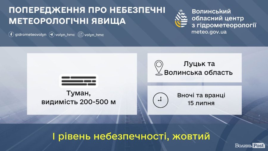 За даними синоптиків, вночі та вранці 15 липня по області та в Луцьку очікується туман з видимістю 200-500 метрів.