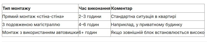 Таблиця: орієнтовний час монтажу кондиціонера залежно від складності