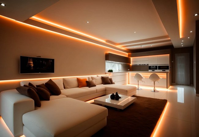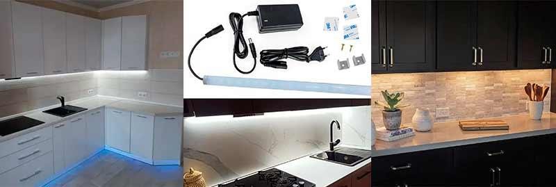 приховане освітлення кухонних зон, полиць, ніш і підсвітки стелі;