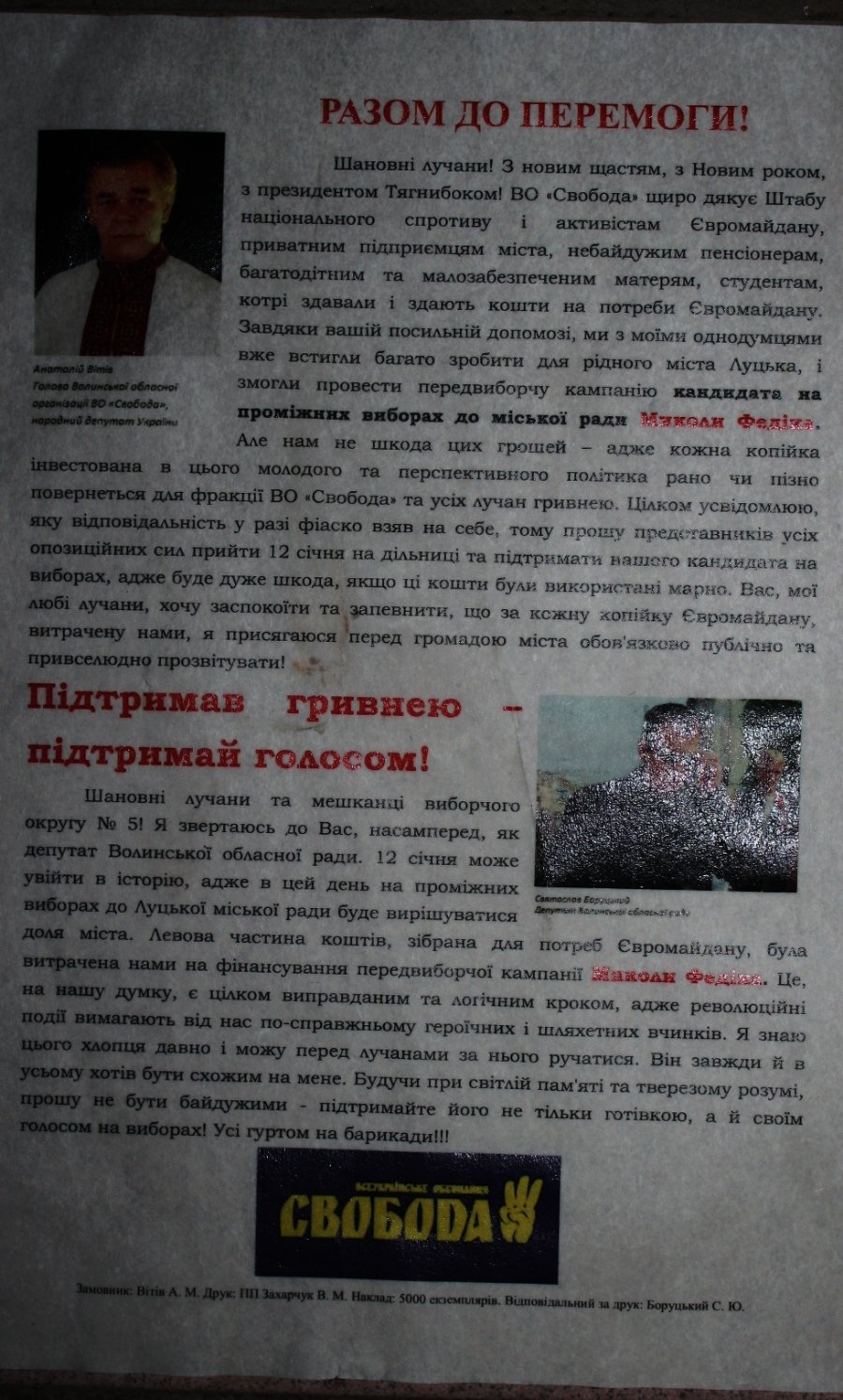 У даній листівці йдеться про те, що кошти, які лучани здавали на підтримку Євромайдану, свободівці, мовляв, витратили на передвиборчу кампанію кандидата Миколи Федіка. У ВО "Свобода" заявляють, що ця інформація недостовірна.
