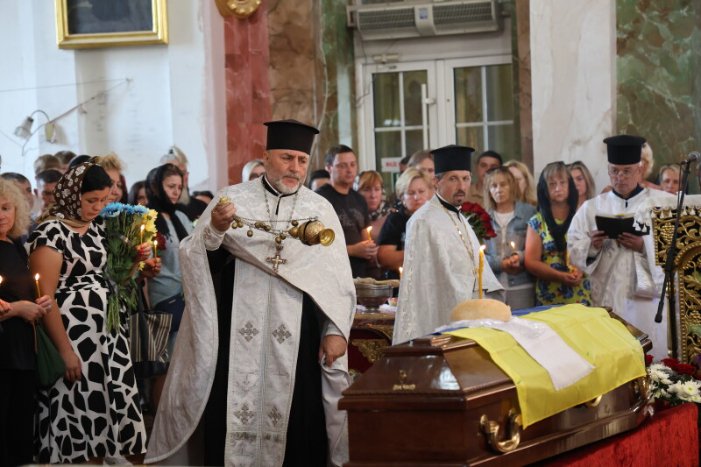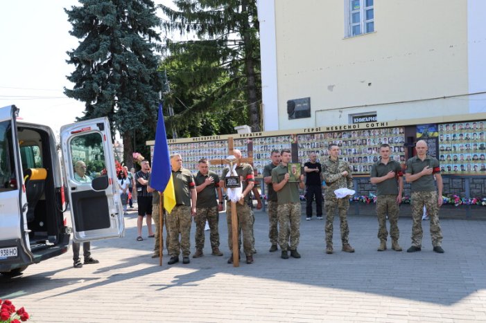 Після закінчення богослужіння труну з тілом військового пронесли Театральним майданом. Біля пам’ятного фотостенда загиблим Героям траурна процесія зупинилася і виконала Державний Гімн.