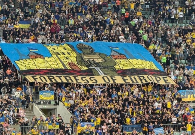 Під час поєдинку збірної України з Францією трибуни українських уболівальників вкотре стали місцем справжнього символізму.Фанати розгорнули масштабний банер із зображенням українського воїна та