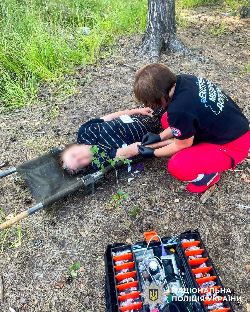 Разом із медиками поліцейський на ношах ніс жінку орієнтовно 600 метрів до транспорту. Пенсіонерку госпіталізували, наразі загрози її життю немає.