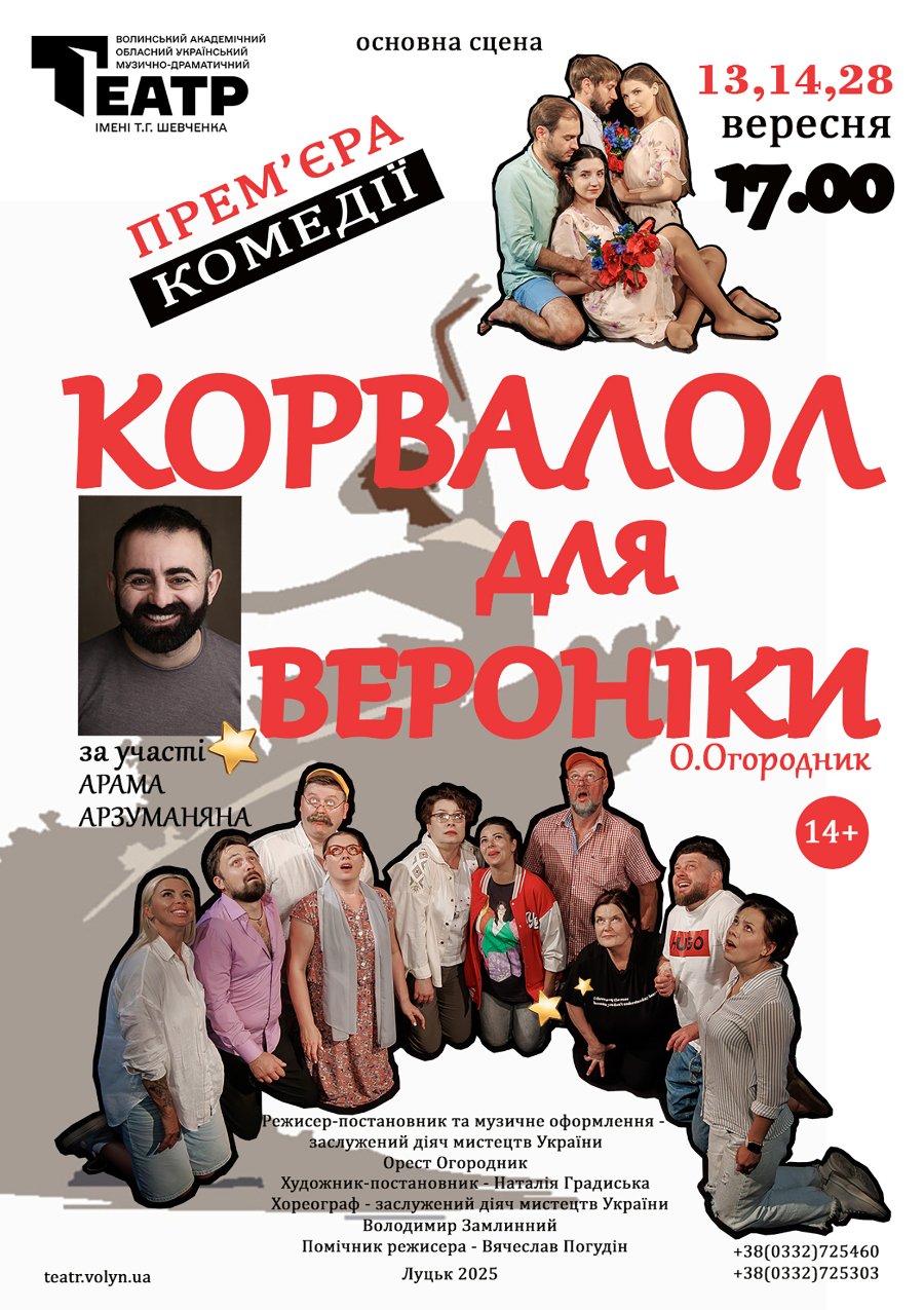 13 вересня, у суботу, у Волинському академічному обласному українському музично-драматичному театрі імені Тараса Шевченка відбудеться прем'єра комедії «Корвалол для Вероніки». Виставу ставлять у співпраці з актором Арамом Арзуманяном, відомим за фільмами «Скажене весілля» та «Скажені сусіди».