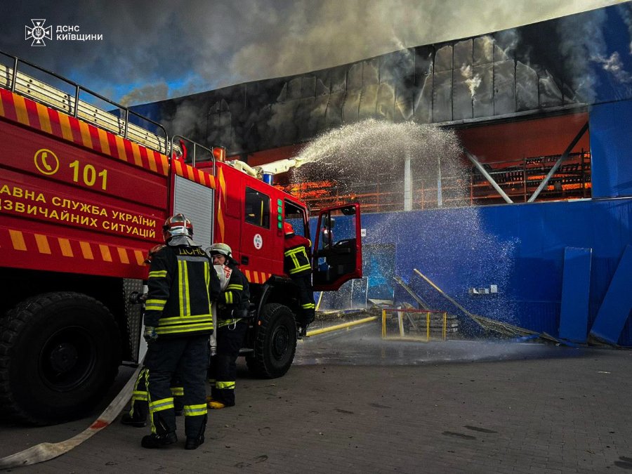 На Київщині триває ліквідація пожежі в складській будівлі «Епіцентру» на Фастівщині, яка виникла внаслідок російського удару БпЛА.