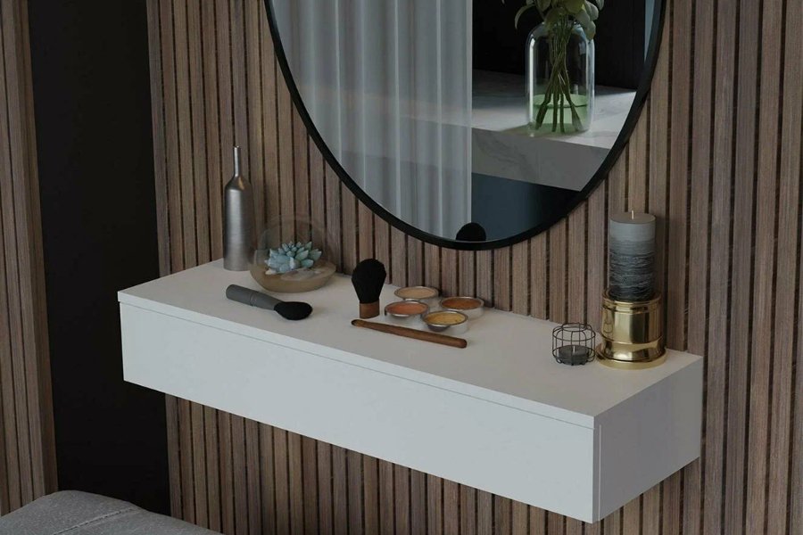 Столик для макіяжу в маленькій спальні звучить, як щось нереальне? Проте, підвісна конструкція врятує ситуацію. Туалетний столик, прикріплений до стіни, має компактні розміри, звільняє місце на підлозі й виконує свою функцію на відмінно. Отож, у Вас буде куточок для ранкових ритуалів краси й простір для пересування кімнатою.