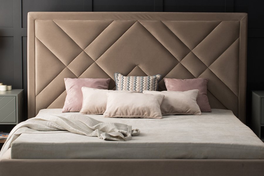 Узголів'я чи каркас ліжка з візерунчастою оббивкою, або ж геометрична виразність з точеними елементами, візьмуть на себе візуальну вагу кімнати. Це дозволить стінам у спальні залишатися максимально просторими на вигляд.