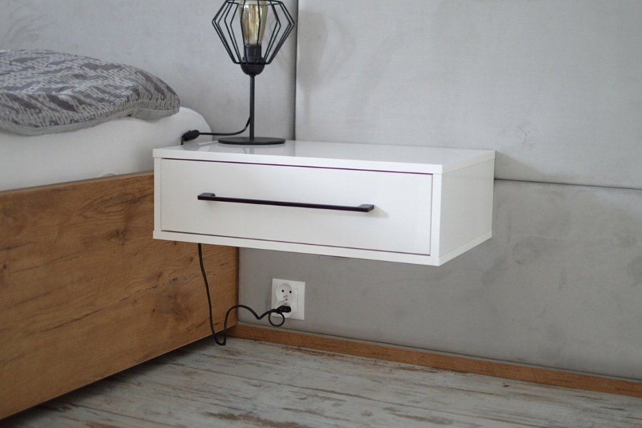 Підвісна тумба в спальні зменшує відчуття тісноти. Над нею варто повісити світильник, а зверху поставити вазон або інший невеликий декор.