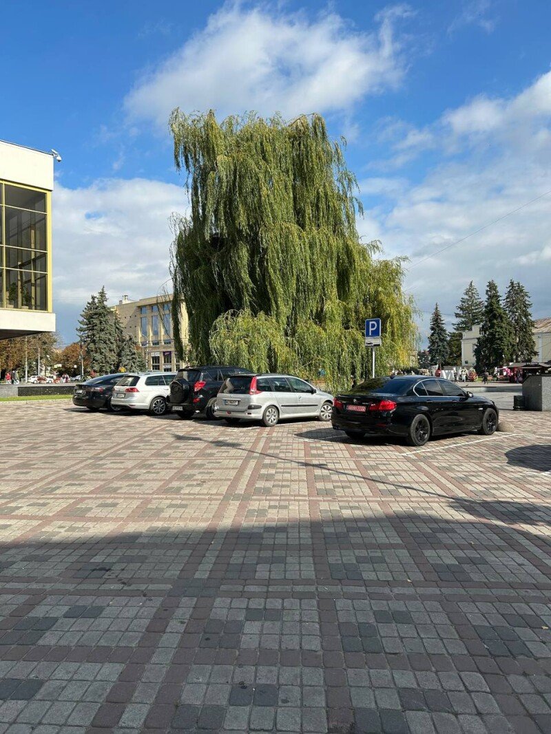 Місця для паркування автомобілів розміщені з обох сторін культурного закладу. Навпроти готелю “Україна” безоплатні місця, з яких чотири передбачено для паркування особам з інвалідністю та стільки ж для електроавтомобілів.