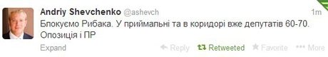 У свою чергу опозиційний депутат Володимир Ар’єв повідомив, що була незначна штовханина у приймальні. За його словами, нарада лідерів фракцій у Рибака триває. За повідомленням опозиціонерів, поки що вони не мають наміру випускати Рибака з кабінету.
