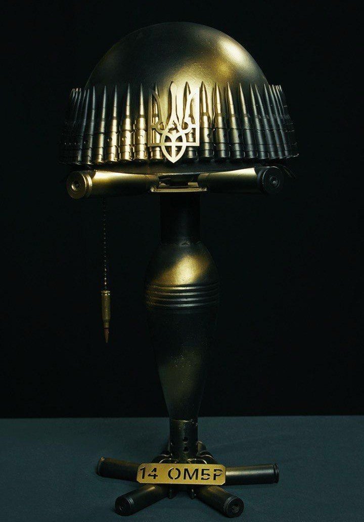лампу з оригінальним абажуром — залізною каскою. Конструкція закріплена на корпусі міни та оздоблена гільзами. Її отримає той, хто зробить найбільший донат.