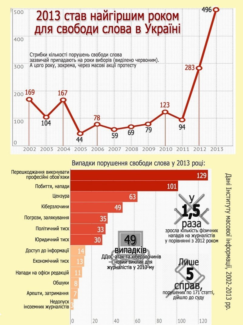 Загалом у 2013 році в рамках щомісячного «Барометру свободи слова» Інститут масової інформації зафіксував 496 порушень свободи слова, що майже вдвічі більше, ніж у 2012 (283 порушення), у шість разів більше, ніж в 2009 році (79 випадків), і в одинадцять разів більше, ніж у 2005-му (44 порушення).