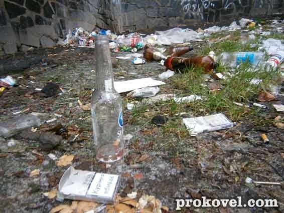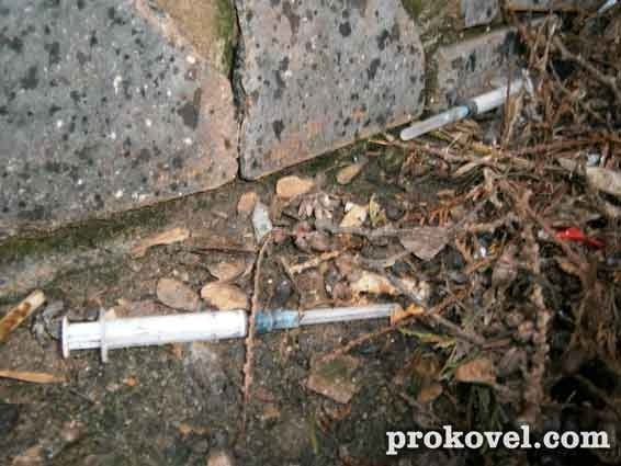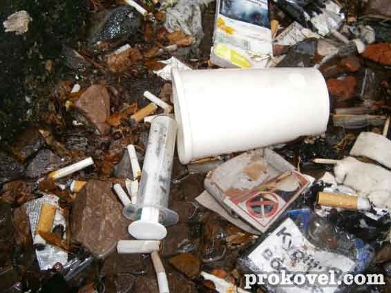 На території також лежать використані медичні шприци, що є доволі небезпечно для дітвори, яка до таких речей проявляє не аби яку цікавість, багато порожніх пляшок, упаковки з-під цигарок та інший непотріб.
