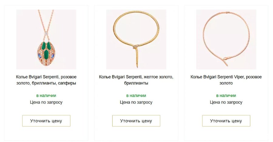 Кожен виріб представлено з детальним описом, історією бренду, рекомендаціями стилістів та даними про походження каменів.
