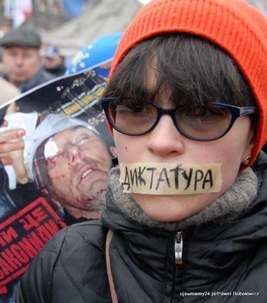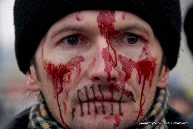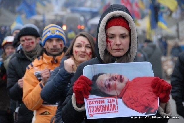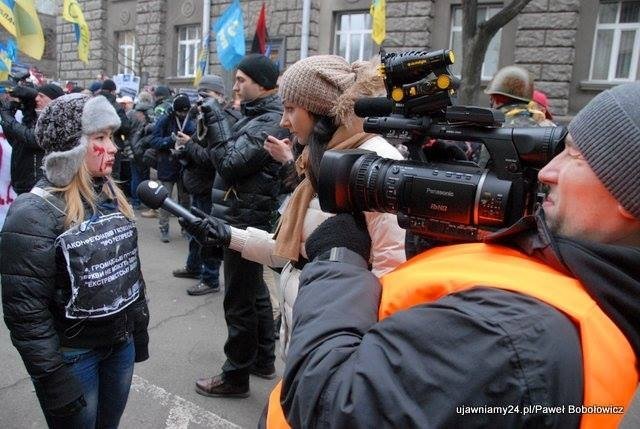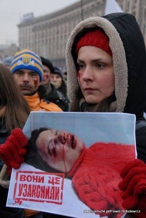 Із «закривавленими» обличчями та «зашитими» ротами активісти Майдану прийшли до Адміністрації Президента. Вони тримали в руках портрети побитих євромайданівців.