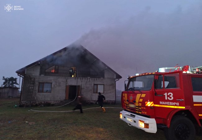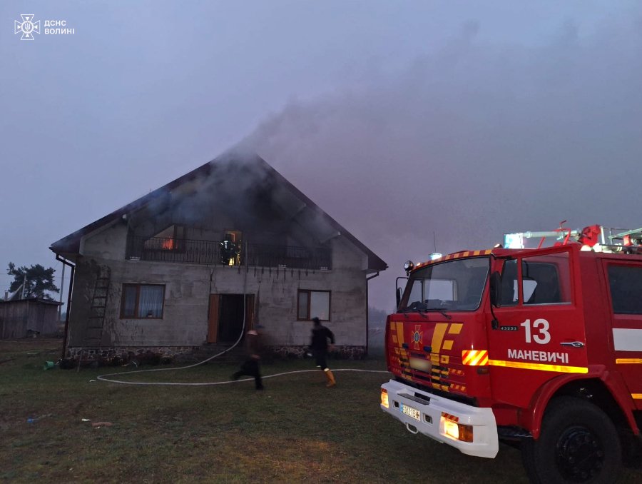 Сьогодні вранці у с. Комарове Маневицької громади горів двоповерховий житловий будинок — полум'я охопило перекриття й покрівлю, поширилося на стіни на другому поверсі. Господиня помітила ознаки пожежі, негайно вивела дітей з помешкання і викликала рятувальників.