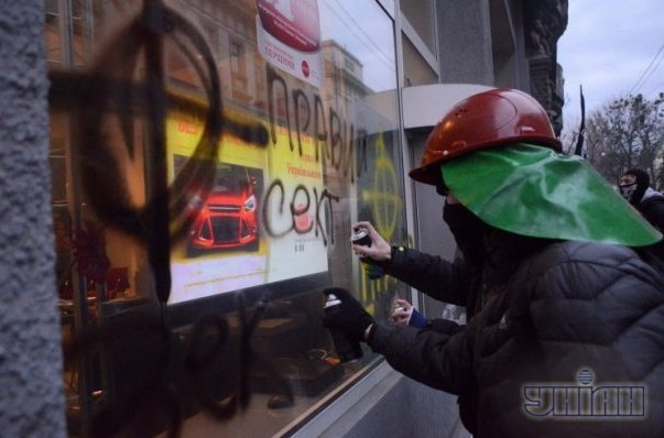 У центрі Львова молодики розмалювали фарбою стіни, фасади і вітрини будинків торговельних підприємств і банків, які належать членам Партії регіонів.