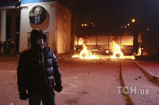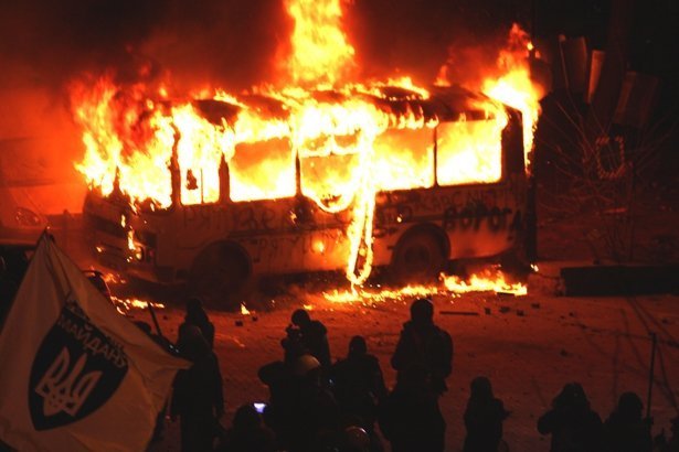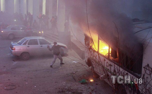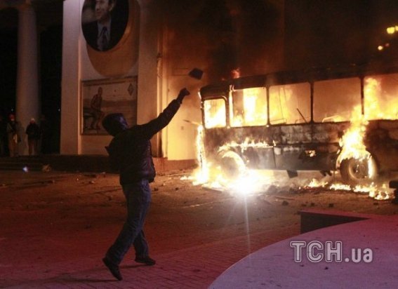 На дальньому плані горить автобус. Активісти заявляли, що підпалили його самі правоохоронці і це - провокація. Фото Ольги Червакової (Українська правда)