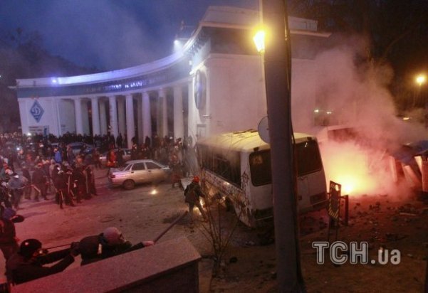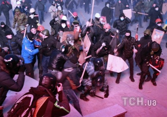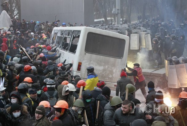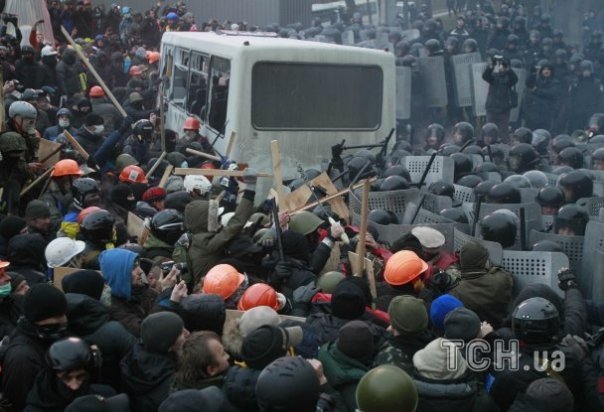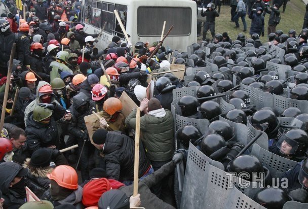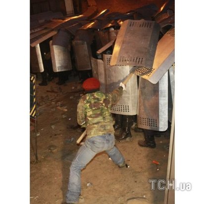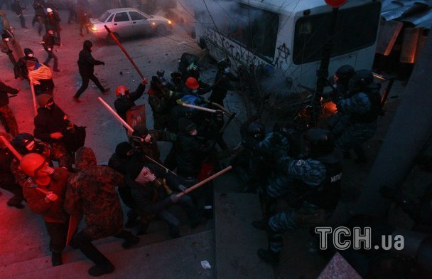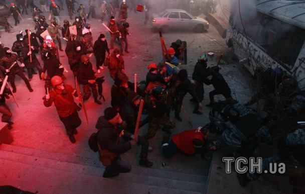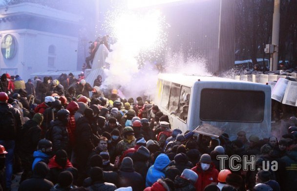 При цьому "Беркут" продовжує закидати натовп світлошумовими гранатами. Міліцією керують невідомі люди в цивільному одязі.
