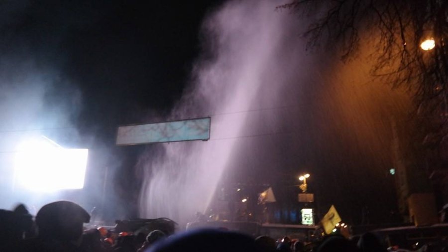 Олександр Аронець у Фейсбуці повідомив: "Почали з водометів розганяти людей. Ті скандують Водохреще))"