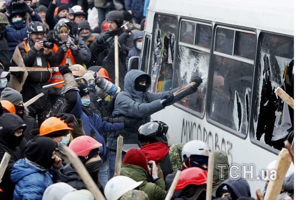 Невідомі у помаранчевих касках, які були у натовпі активістів, почали бити палками кордон охорони внутрішніх військ.