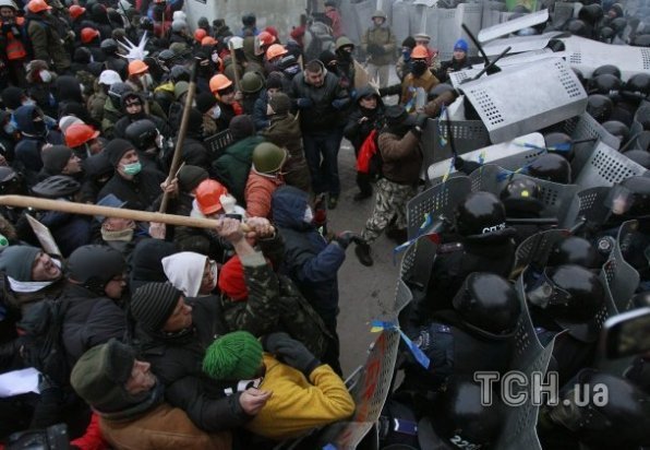 У Києві на вулиці Грушевського, яка перекрита кордоном внутрішніх військ, триває протистояння між учасниками Євромайдану, які намагалися прорватися до Урядового кварталу, і внутрішніми військами.