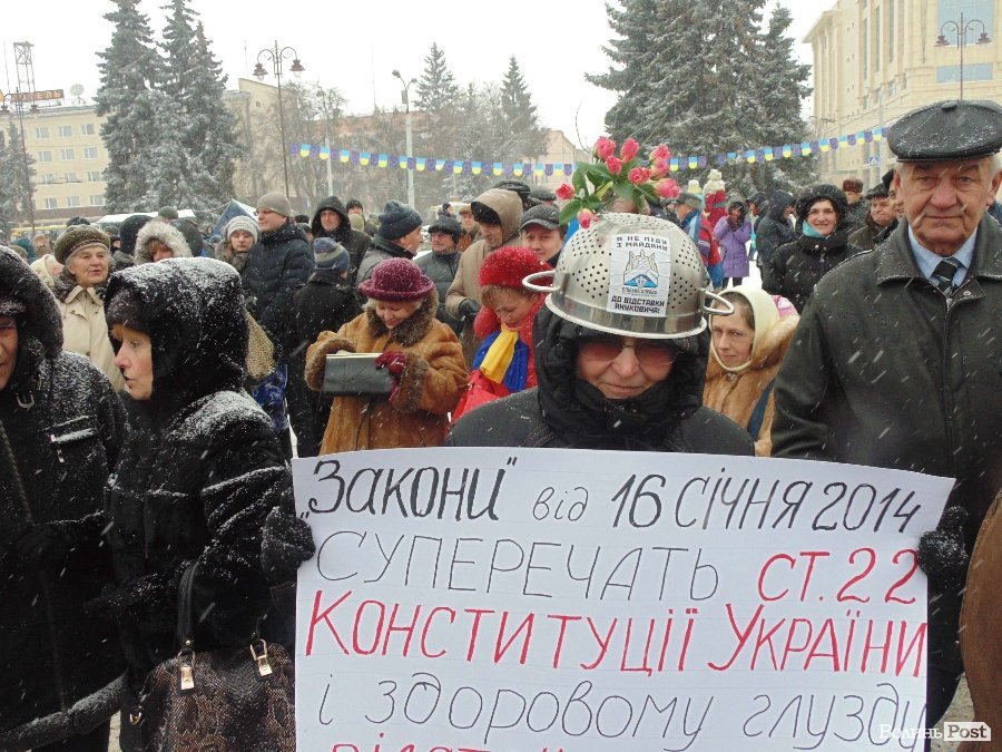 "16 січня 2014 року підконтрольна владі більшість у Верховній раді нахабно з порушенням Конституції та Регламенту у нелегітимний спосіб прийняла ряд законів, які свідчать про продовження тотального наступу на основоположні права та свободи громадян, гарантовані констуцією та встановлюють в Україні диктатуру правлячого режиму Партії регіонів та Віктора Януковича. Розцінюємо прийняття таких законів в Україні, як спробу державного перевороту.