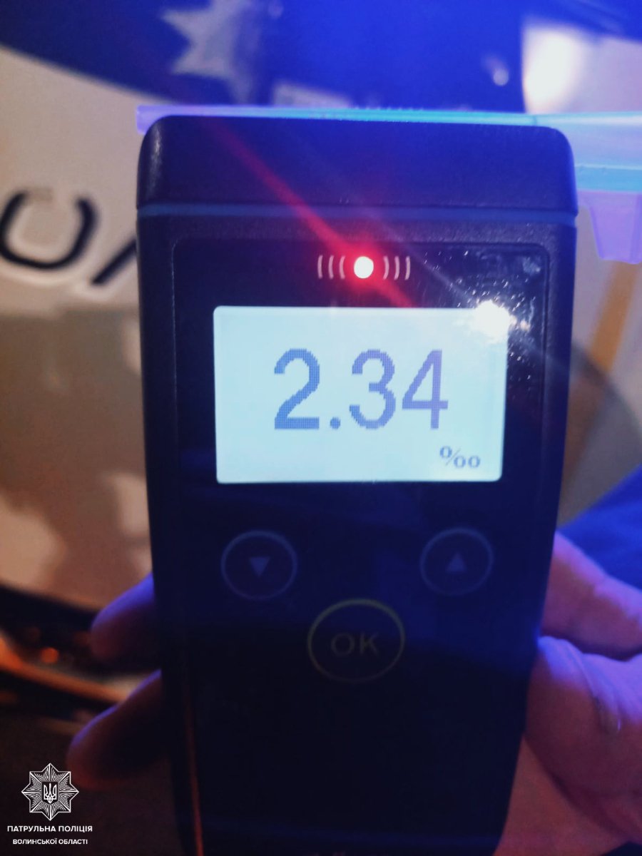 Водієві запропонували пройти огляд на стан сп’яніння за допомогою приладу Драгер у встановленому законом порядку. Результат — 2,34 проміле, що більш ніж у 11 разів перевищує допустиму межу.