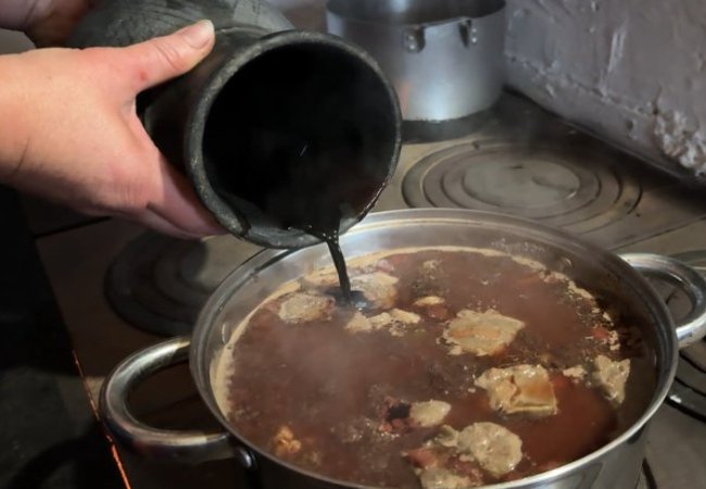 "Водичка не солиться, бо буряки квашені вже присолені. Варимо буряки десь пів години і додаємо кістку з під горлиці, нирки і печінку легку і тяжку. Кісточки в нас уже порубані. Бо хлопці, як розбирають кабана, вони вже рубають там",— говорить Галина Жипа.