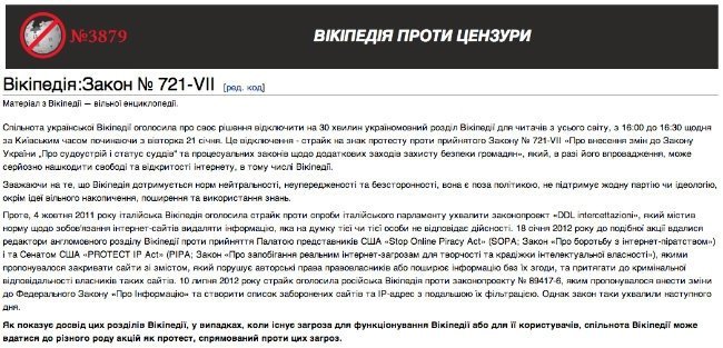 Найбільша інтернет-енциклопедія України «Вікіпедія» оголосила страйк через новоприйняті поспіхом закони 16 січня.