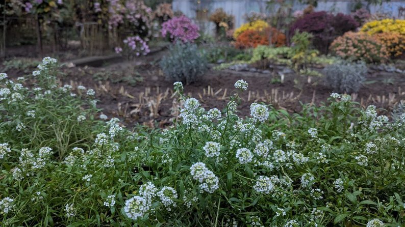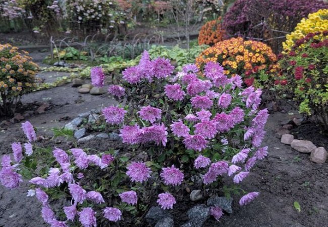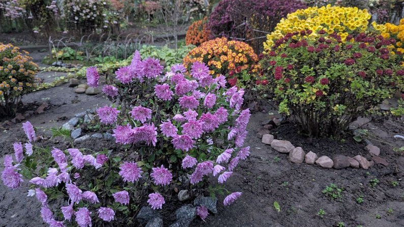 "Напевно ніде немає таких великих клумб. У нас такий мікроклімат, бачите: ще троянди цвітуть, крокуси, вилазять тюльпани. Це якась аномалія. Грунтопокривні будуть і з-під снігу виглядати. І ще кам’яна троянда... Пізні сорти хризантем цвітуть досі, ранні позрізали, готуємо клумби до зими", — каже Галина Антонівна.