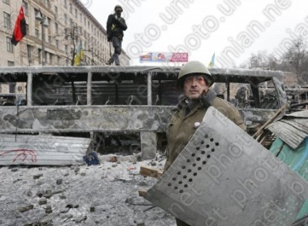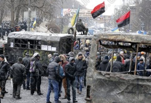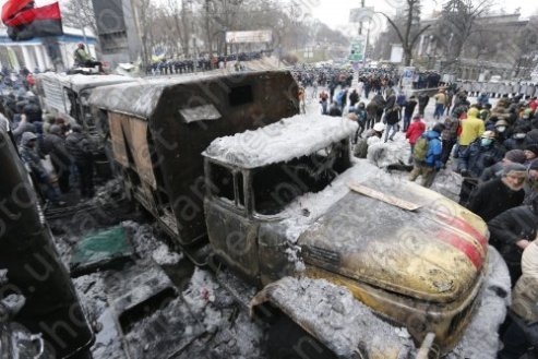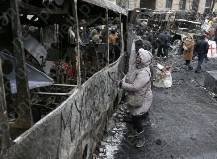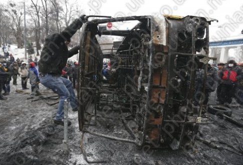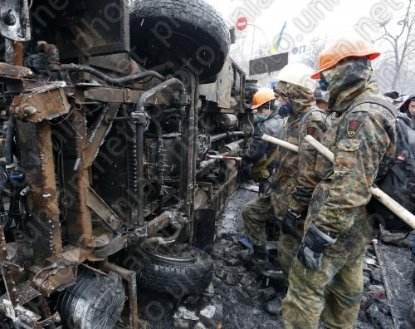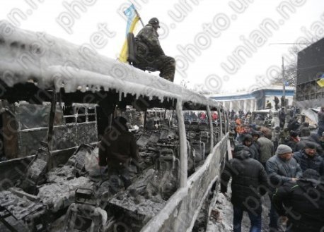 У центрі Києва на вулиці Грушевського укріплюють барикади обгорілими автобусами беркутівців та просять долучитися до «революційного флешмобу».