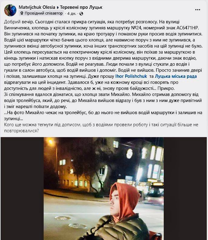 Поліцейські Луцького РУП притягнули до адмінвідповідальності водія «маршрутки», який проігнорував хлопця на кріслі колісному.