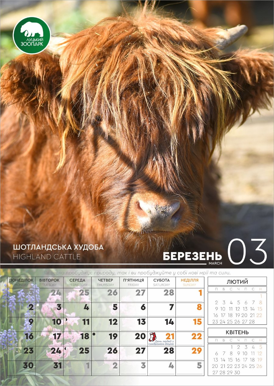 Як повідомили в зоопарку, через соціальну відповідальність та вірність принципу: «Всі різні — всі рівні», в календарі є важливі нагадування про Всесвітній день людей із синдромом Дауна.